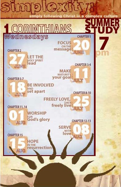 Tonight is the start of “Simplexity” our Summer Study of 1 Corinthians — should be a great chance to dig in to a very interesting book of the Bible. Be here at 7:00pm — childcare provided!!